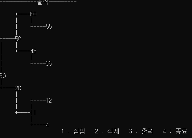 printf("1 : 삽입 2 : 삭제 3 : 출력 4 : 종료\n");