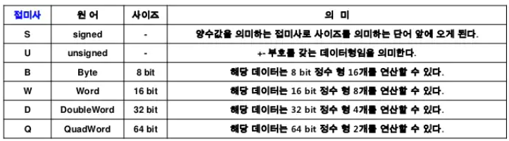 접두사 P는 'packed'를 의미하며 정수형 SIMD 명령어이다. 실수형 SIMD 명령어는 P 접사가 뒤에 붙어 실수형과 정수형을 구분하게 된다(4장 참조).