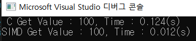 cout << "SIMD Get Value : " << nResult << ", Time : " << (float)(end_simd - start_simd) / 1000 << "(s)" << endl;